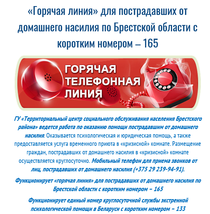 Получить помощь в предоставлении временного приюта можно, позвонив в ГУ "Территориальный центр социального обслуживания населения Брестского района" по телефонам 53-74-81, 95-90-57 в рабочее время, или обратившись во внерабочее время и выходные дни на телефон экстренного вызова милиции 102.